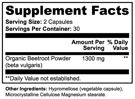 Ingredients: Organic Beetroot Powder (beta vulgaris) 1300mg, Hypromellose (vegetable capsule), Microcrystalline Cellulose, Magnesium Stearate.